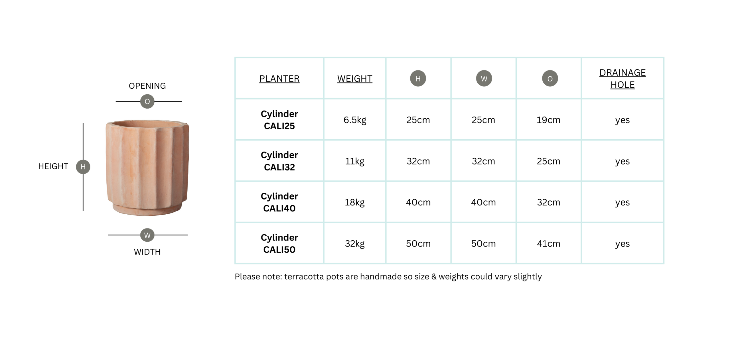 The Calliope Terracotta pots with wide grooved vertical lines are available in four sizes. Perfect outdoors as a feature pot or group filled with succulents or cacti creating a wonderful urban rustic charm. Handmade, using ancient craftmanship these pots are all unique pieces. Outdoor use only. All include drainage holes.