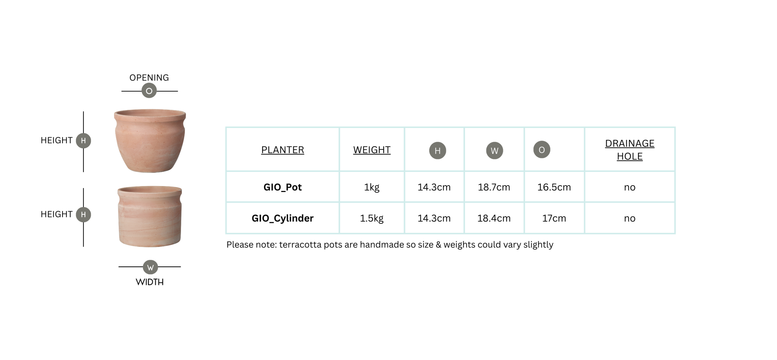 The Giotto Terracotta Pot and Cylinder are traditionally crafted in Italy out of natural Galestro clay from the hills of Tuscany. With a beautiful smooth textured finish, they are beautiful paired on an indoor or outdoor table or shelf. Drainage holes not included.