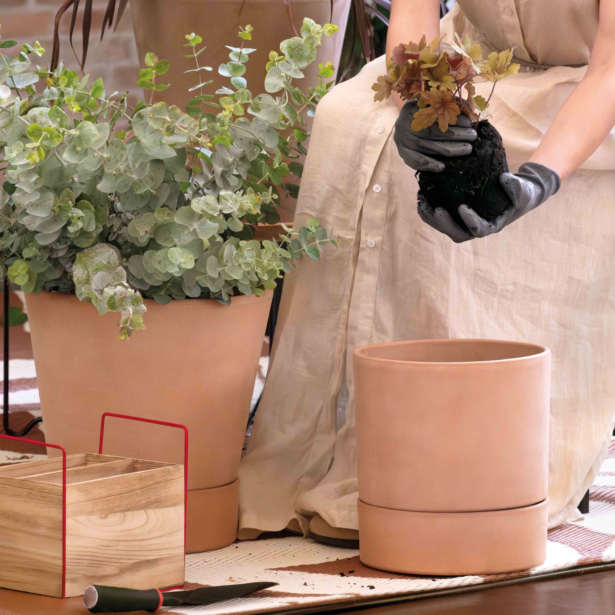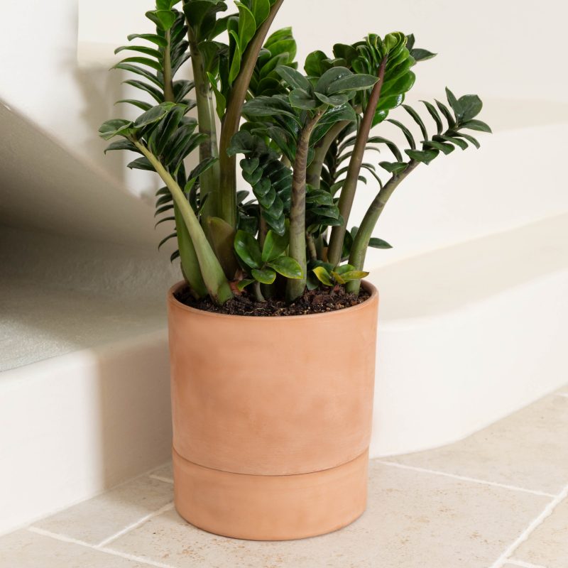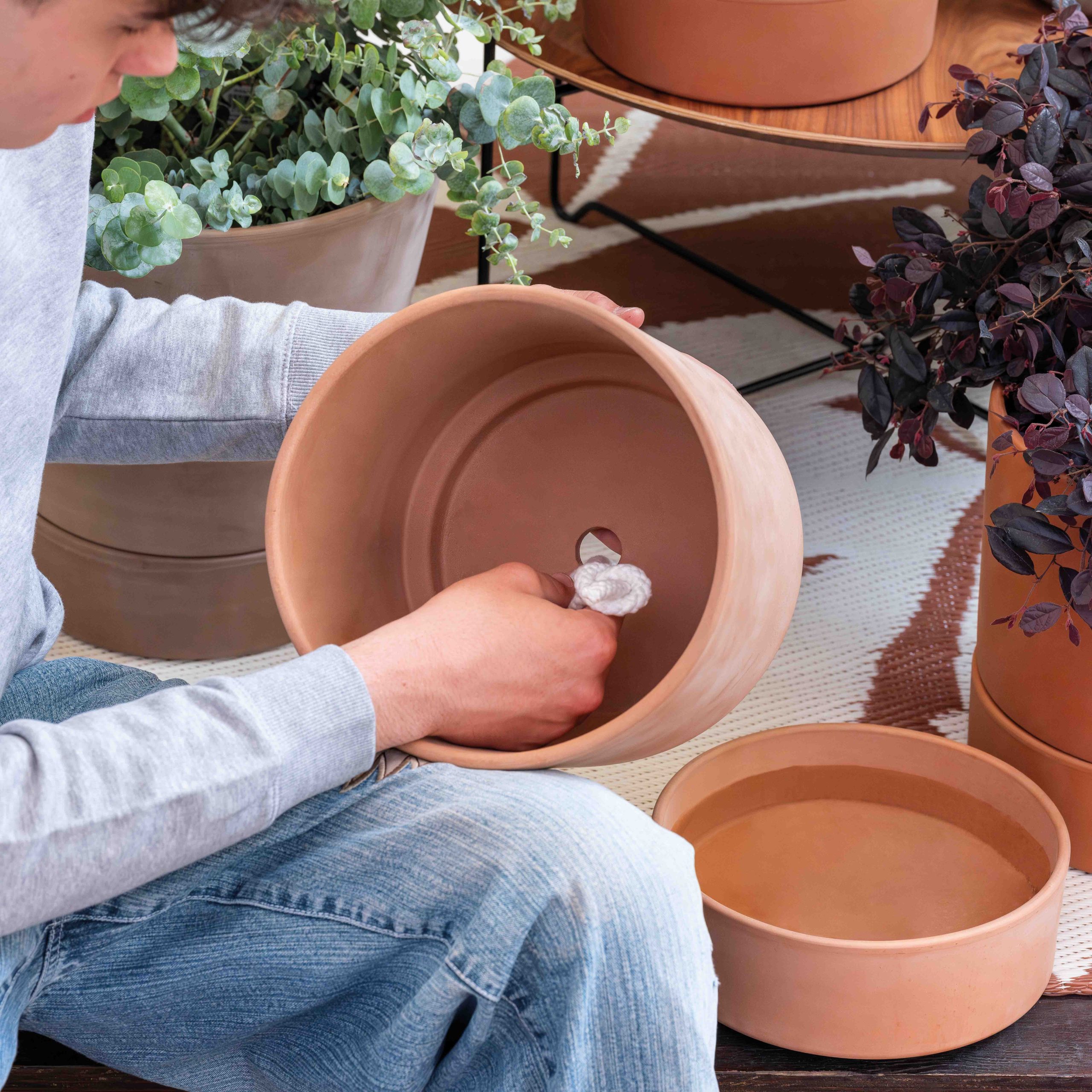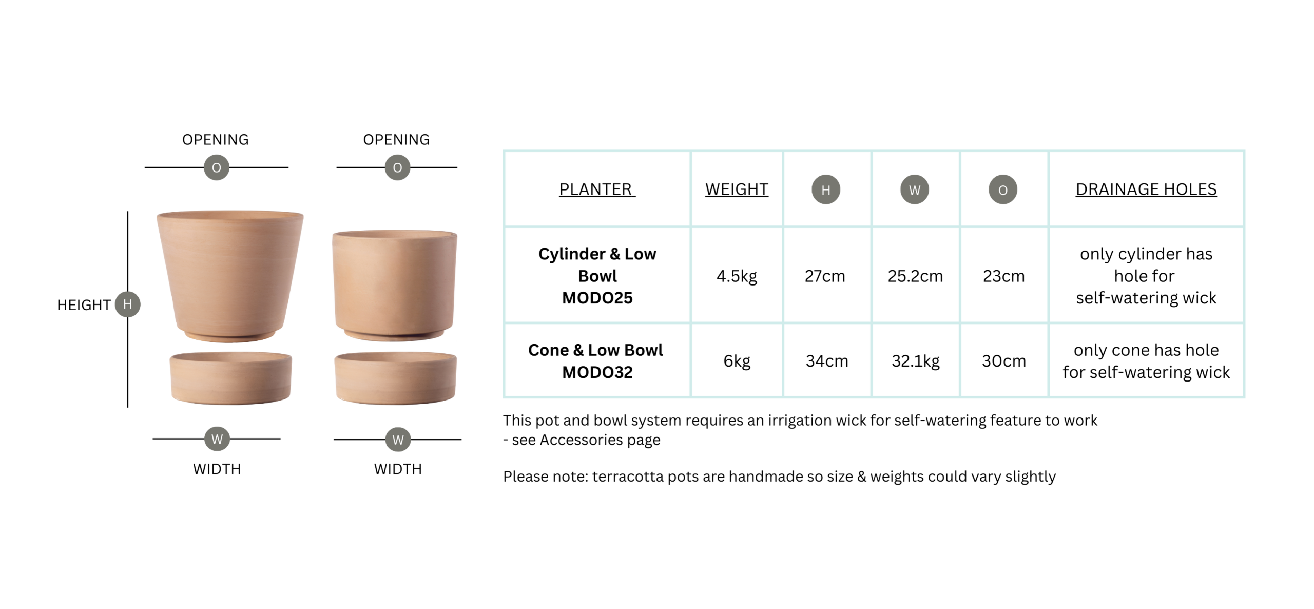 Made in Italy, the ModulโO kit is made up of a Cone Pot and Bowl. This natural terracotta water reserve cylinder and bowl set can use a cotton wicking system thread through a hole between vase and bowl. Capillarly action then draws water from the water-filled bottom bowl via the wick to water the potted plant above allowing for self-watering to take place. See our Irrigation cord/wick in accessories