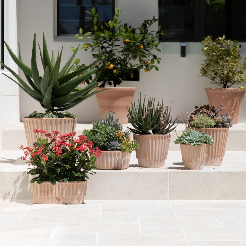 The unique textured finish on the Bronte Pots, Modica Bowl and Taormina Window box add an architectural touch to any space. Perfect for smaller potted table and floor-standing arrangements. The pot and bowl include drainage holes, but not the window box.