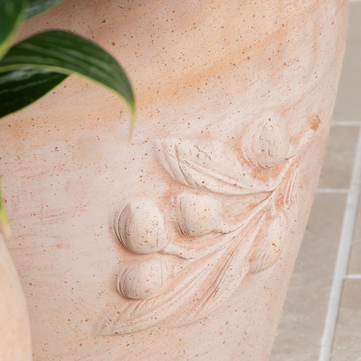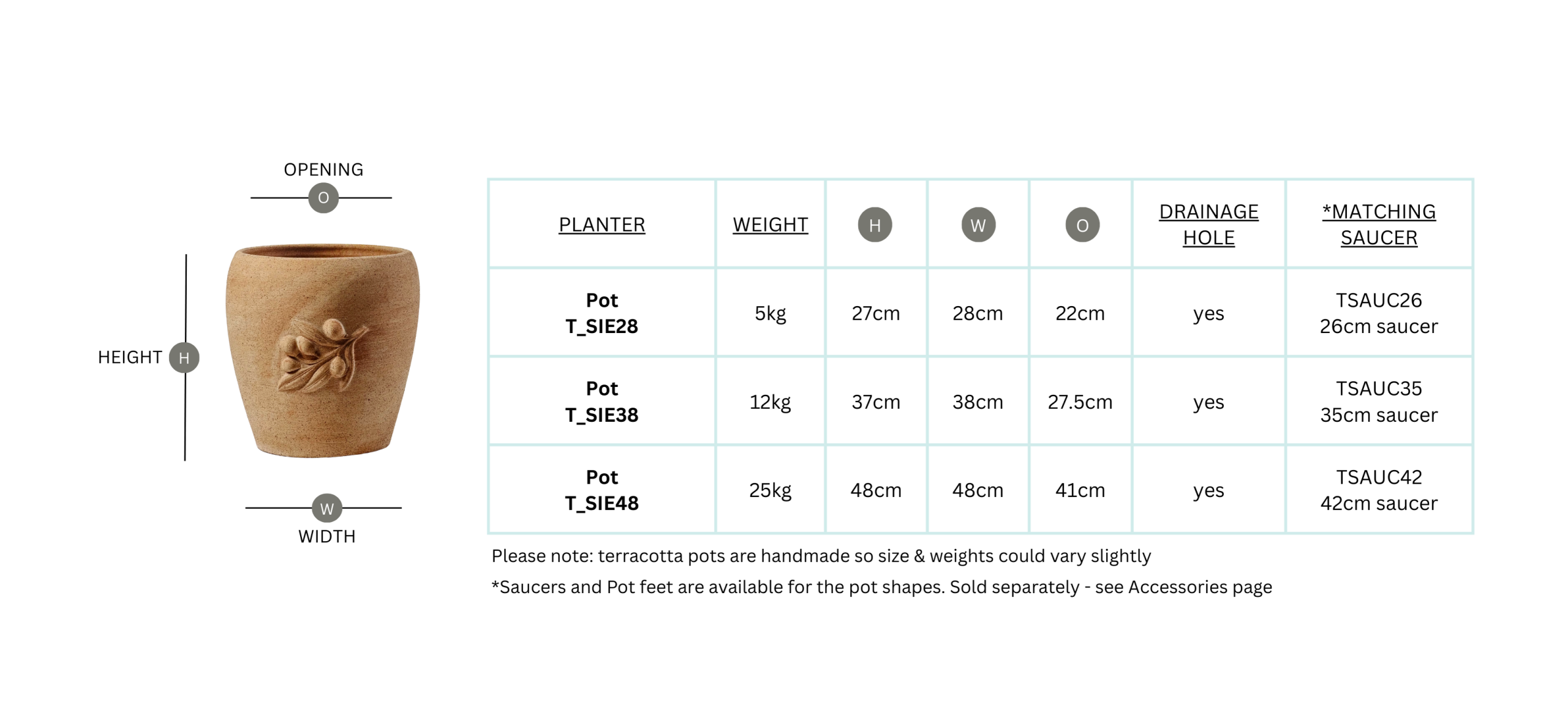 The Siena Olive terracotta pots with beautiful olive branch motif are handcrafted in Italy out of natural Galestro clay from the hills of Tuscany. Floor-standing only, they are perfect together or as a single feature pot in an outdoor or terraced space. They are suitable for indoor or outdoor use. Drainage holes are included. Saucer recommended for indoor use – see accessories