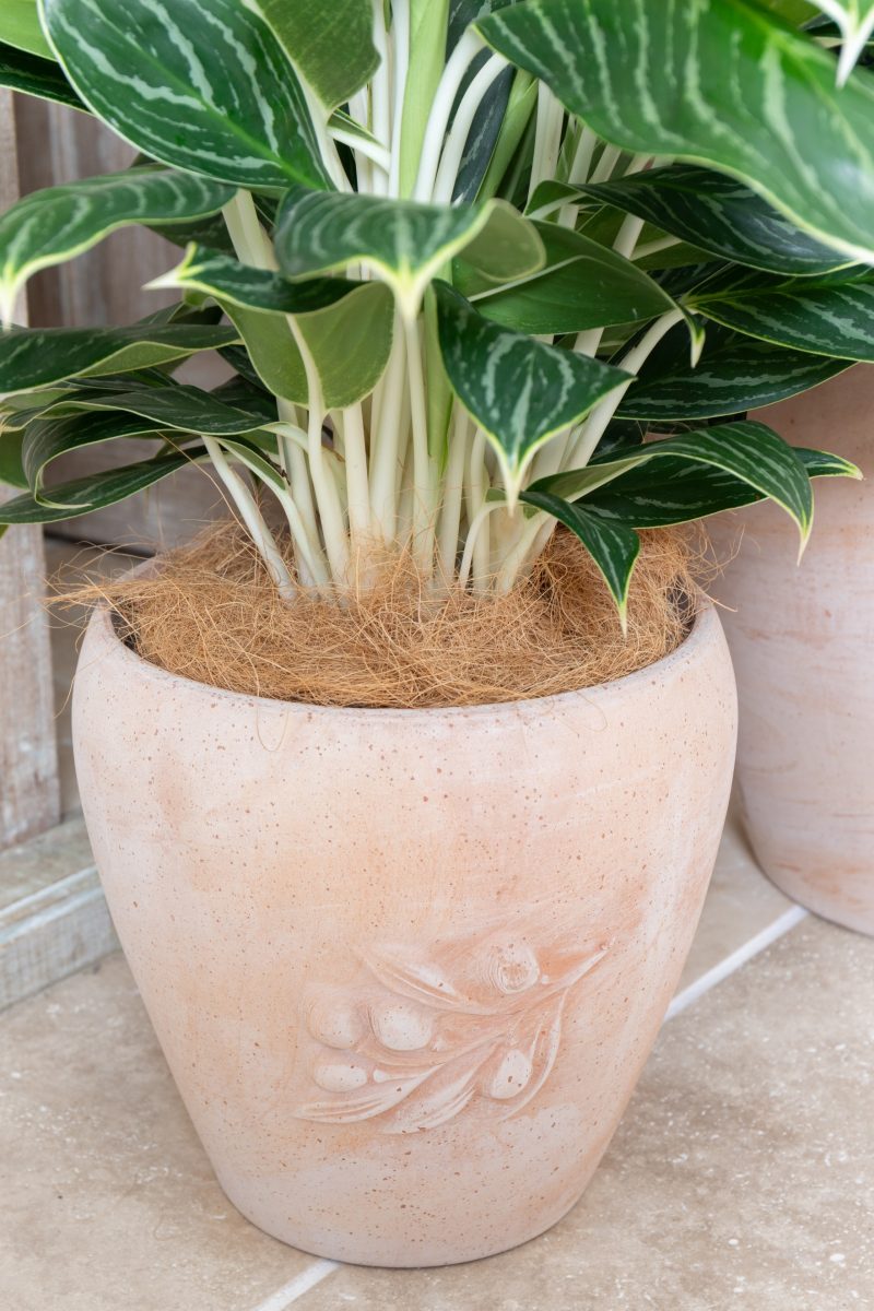 The Siena Olive terracotta pots with beautiful olive branch motif are handcrafted in Italy out of natural Galestro clay from the hills of Tuscany.