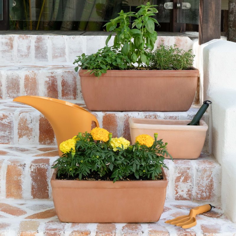Vesta is a terracotta planter box with a contemporary design. The right habitat for your plants! Perfect for potted pretties or a small herb garden. Has matching saucer available. Indoor or outdoor use. All include drainage holes.